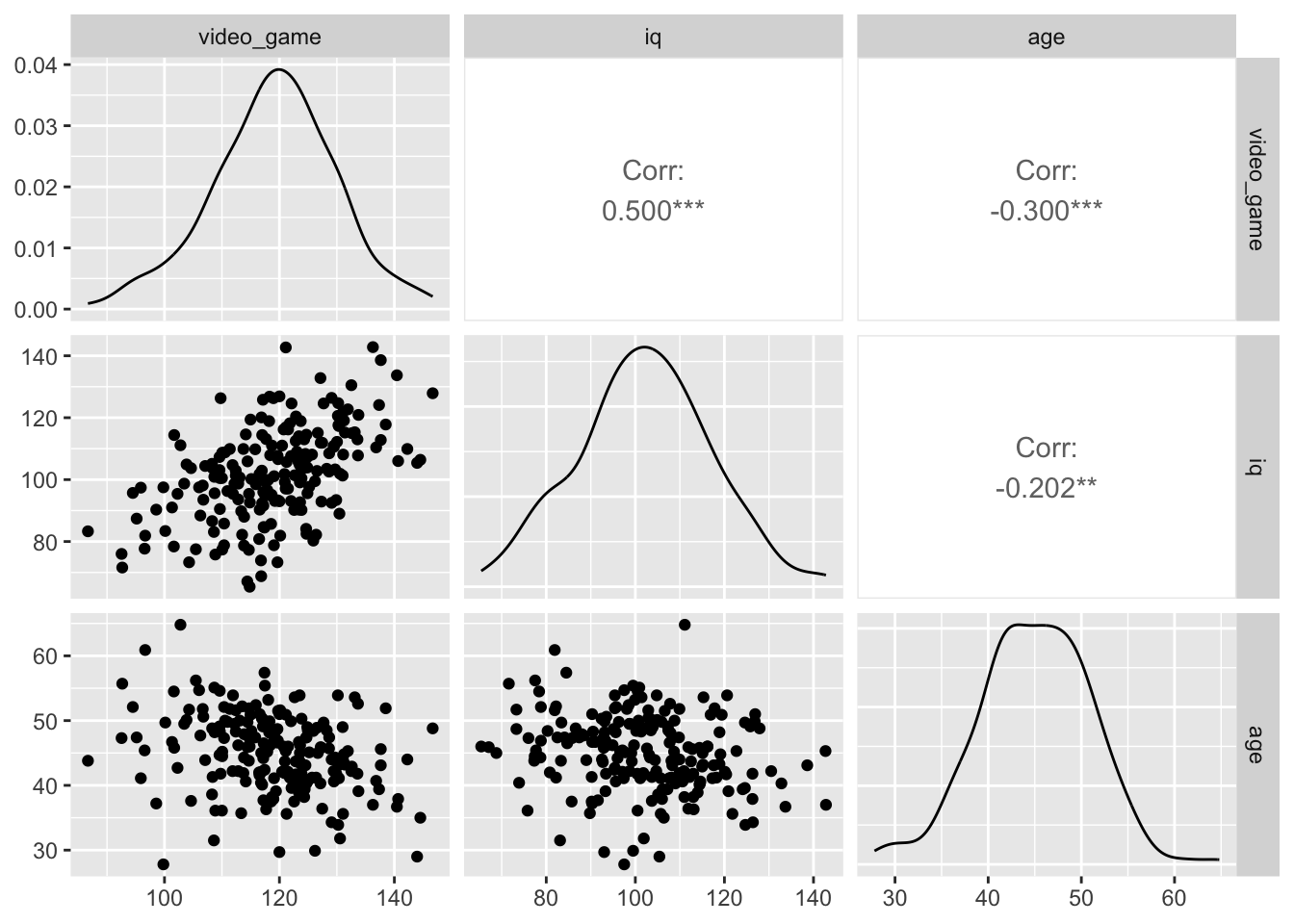 Then we correlate IQ without age (i.e., iq_without_age) with video game scores (i.e., video_game). This tells us how IQ correlates with video game scores when the effects of age have been removed from IQ; that is, the semi-partial correlation (i.e., \(sr\)). Once again refer to the venn diagram above illustrating \(sr^2\).