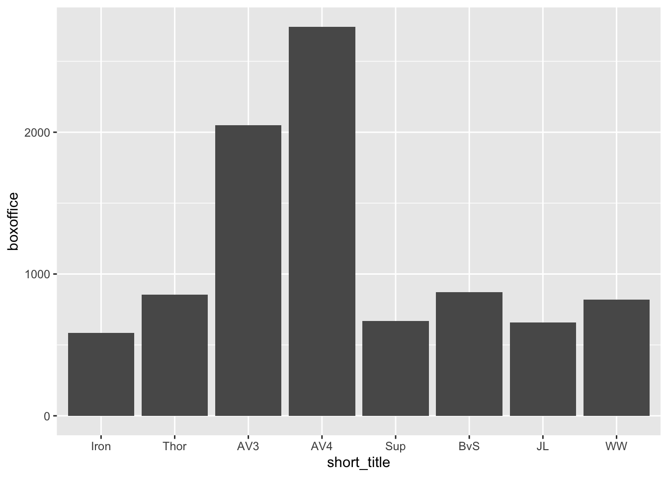 The values along the x-axis come from the short_title column which is a factor. The levels of that factor correspond to the short titles for the movies (Iron, Thor, etc.). We need to relabel the levels of the short_title factor to get a graph with full titles. We relabel the levels of the short_title factor using the scale_x_discrete() command. The graph code with scale_x_discrete() command is below - notice the problem we have with the labels overlapping though. On the next page, we’ll use an easier approach though - since we have an extra column with the full titles.