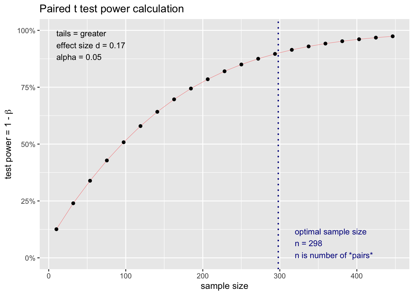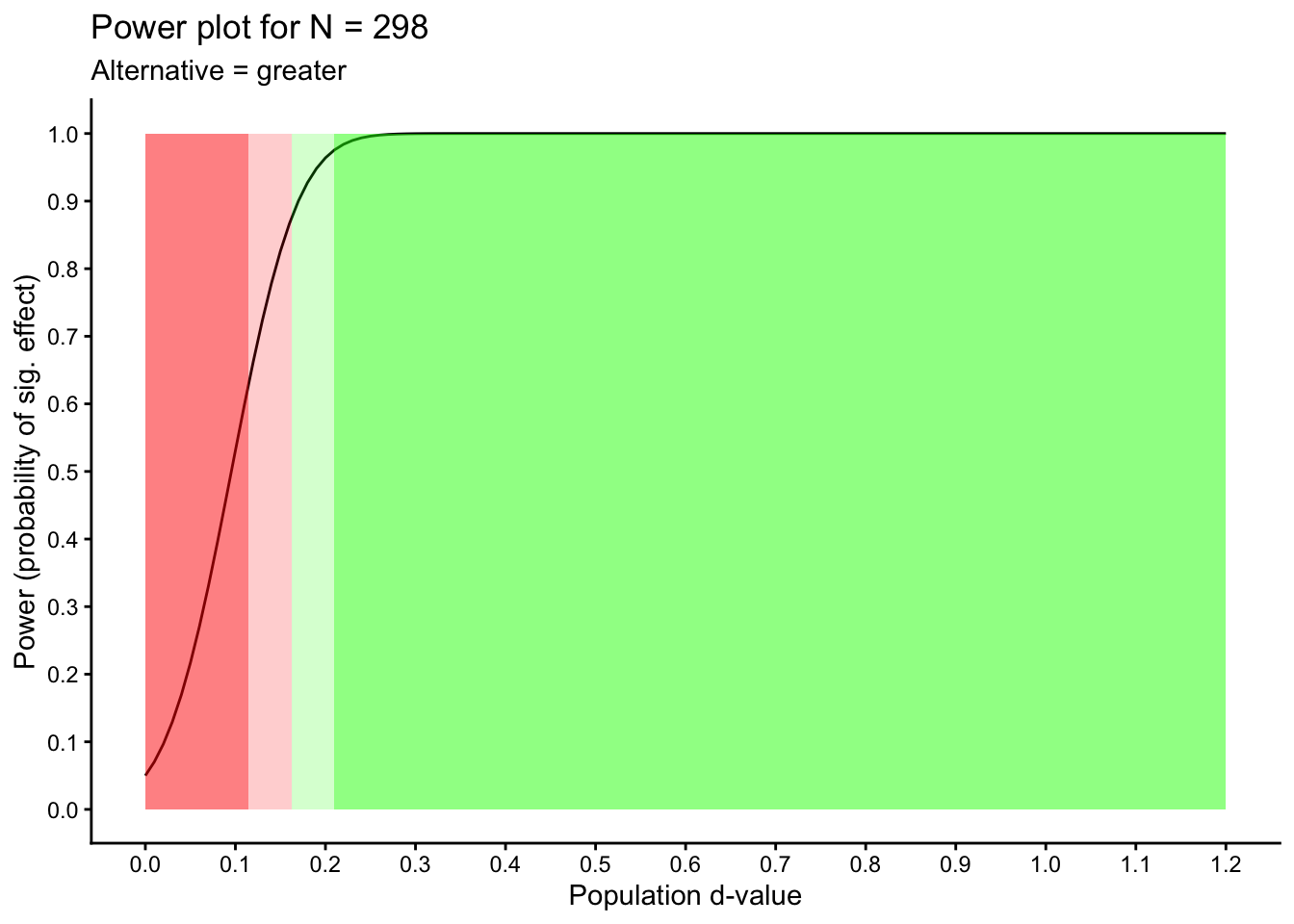 This indicates that with a sample size of 298 that only repeated measures \(d\)-values greater than \(d\) = 0.10 (rounded) will be significant.