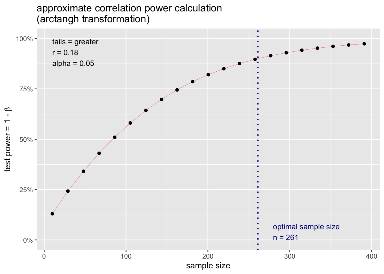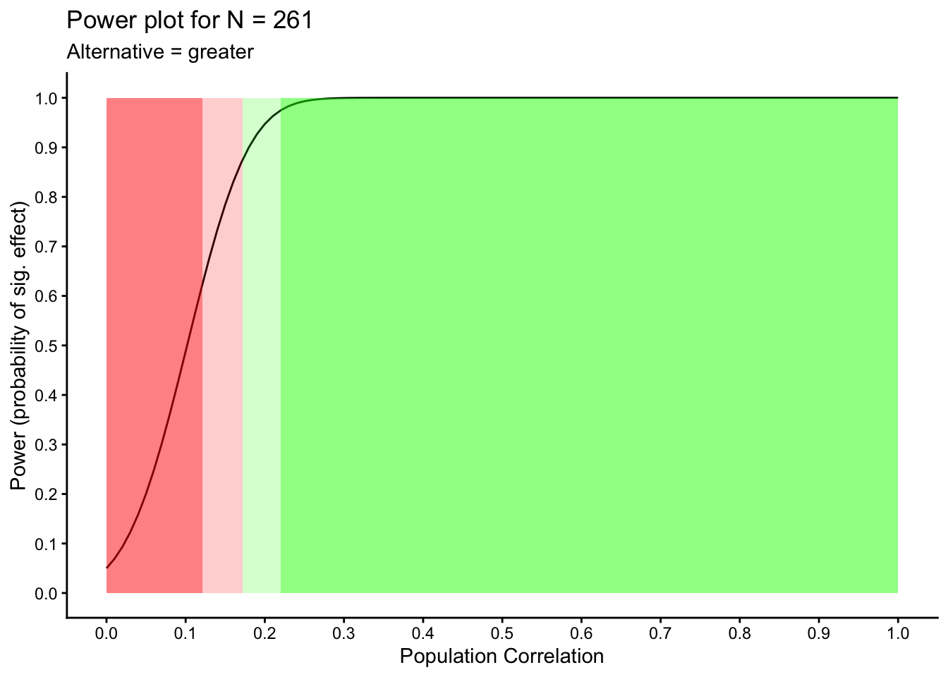 This analysis reveals that a) if we assume the population correlation is .18 (\(\rho = .18\)) and b) desire a 90% chance of finding our effect if it exits - we need 261 participants.